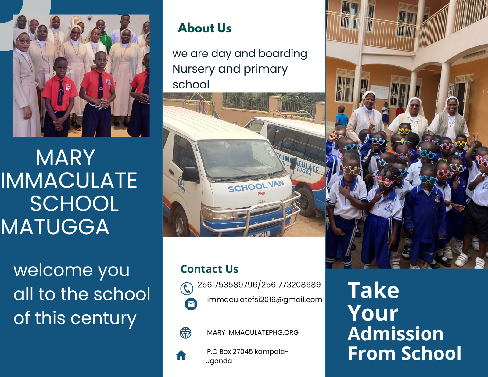 We have a nursey and primary section, running from nursery up to primary seven. Mary Immaculate School is a day and boarding school with very well arranged and organized dormitories. we have school vans which pick up and drop our children too and from school